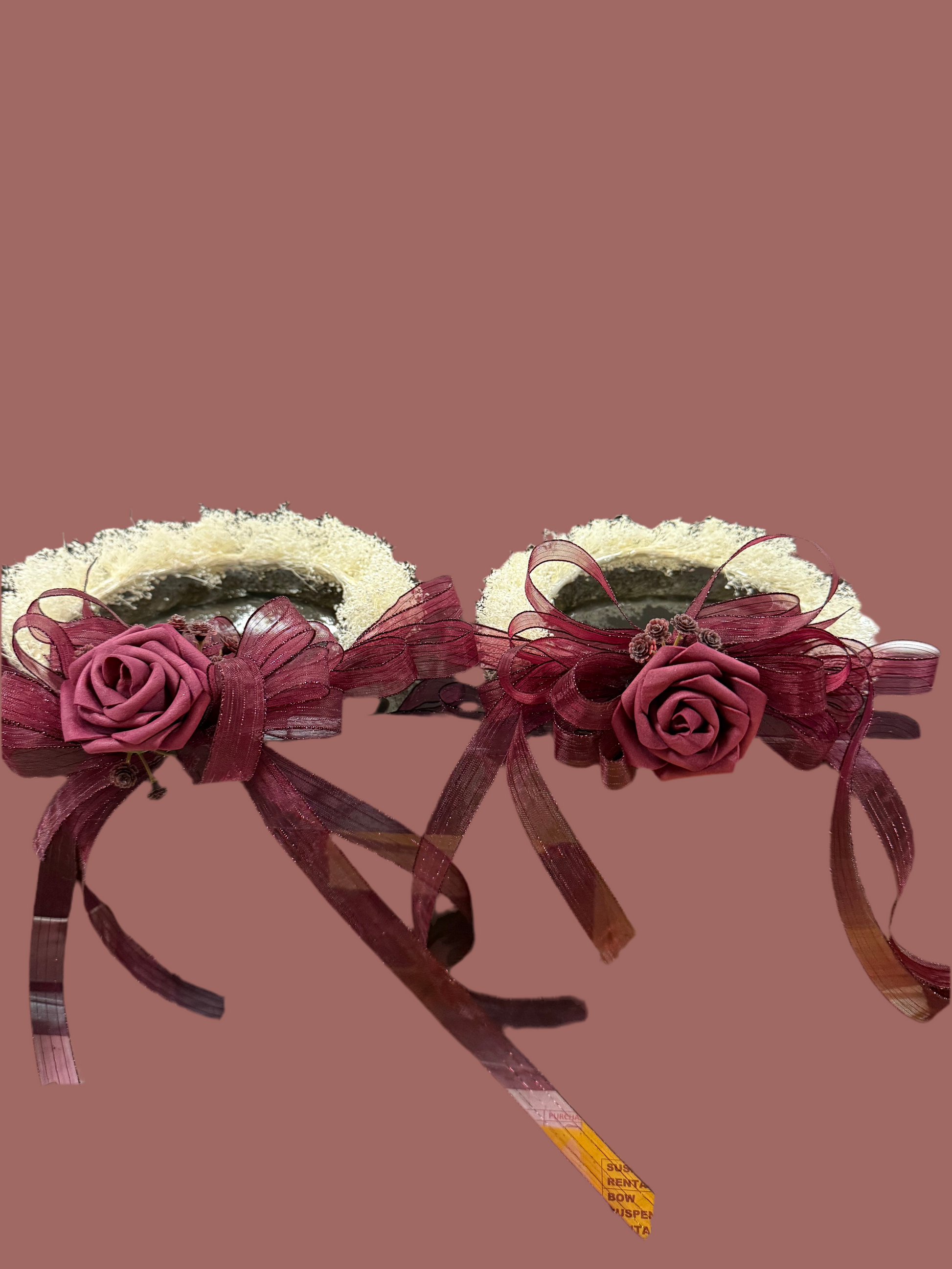 Beautiful Halo wrapped with preserved baby’s breath. Available in many colors for brides or flower girls.